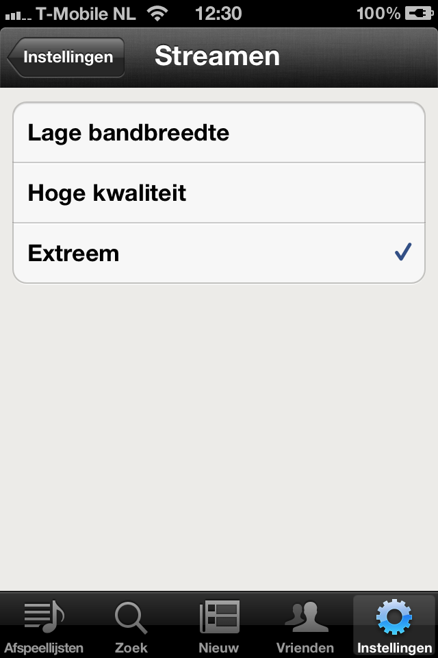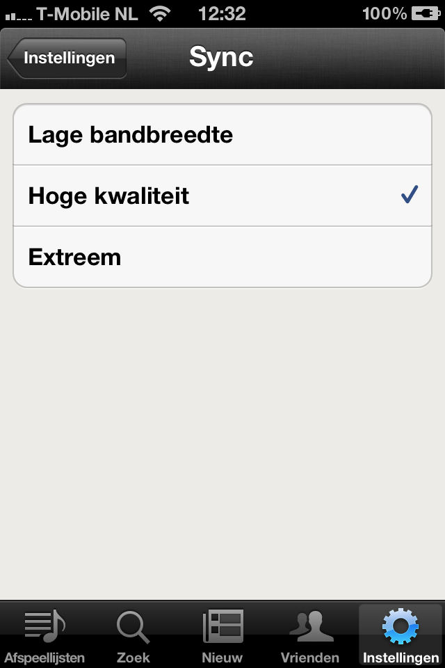 Wat betreft de hogere kwaliteit, ik denk dat voor gemiddeld gebruiker 160kbps prima is. Ik heb er vrij hoge kwaliteit oordopjes in zitten, dus bij bepaalde tonen kan je het verschil horen. Jammer dat de optie er niet is om enkel voor 320kbps muziek te kiezen als je op een WiFi netwerk zit! Scheelt weer laadtijd en data..
