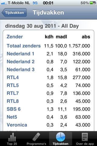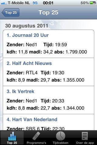 De gratis applicatie biedt gebruikers een top 25 van meest bekeken programma’s per uitzenddag. In dit overzicht vind je statistieken terug als de kijkdichtheid (kdh), marktaandeel (madl) en het absolute aantal kijkers (abs). Diezelfde top 25 kun je ook per zender raadplegen. Ten slotte kun je per dag nog overzichten opvragen voor de belangrijkste tijdvakken (all day en primetime).