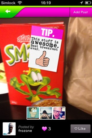 Naast de bewerkingen van anderen, kan je ook zelf een Stiktu achterlaten met de knop Add Post in de rechter bovenhoek. De applicatie vraagt je dan om een gebied van de afbeelding uit te snijden zodat hij specifieker te werk kan gaan. Vervolgens kun je op dat gedeelte van de afbeelding tekenen met je vingers, een tekst deponeren en stickers plakken. Dat kunnen foto’s zijn uit je album, maar ook standaardstickers zoals waarderingssterren, een duim omhoog of een hipster-bril. Als het resultaat is geüpload en al dan niet gedeeld is via je Twitter of Facebook, komt het in het middelste tabblad Stiktu terecht. Die laat eerst de recente creaties zien en daarna de populaire. Je kan die creaties zien zonder scanmodus. De gescande afbeelding staat namelijk op de achtergrond en de lagen, teksten en tekeningen die erop zijn gemaakt kan je eraf slepen. Met de Profile-pagina zie je de laatste ontwikkelingen zoals likes en uploads van vrienden. Die kan je volgen in de app en toevoegen via Facebook. Ook bij een account aanmaken schiet Facebook te hulp, maar je kan jezelf ook zonder het sociale netwerk op Stiktu registeren.