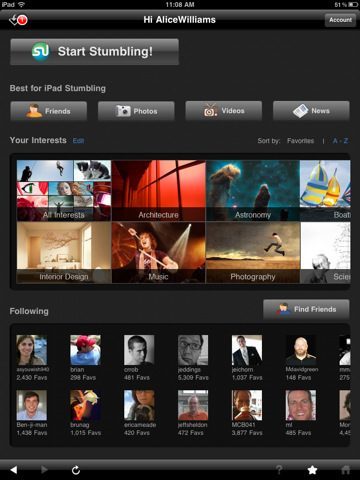 Om gebruik van StumbleUpon te maken heb je een account nodig. Aan deze account zijn jouw interesses en pagina’s die je eerder al leuk vond gebonden, informatie die StumbleUpon weer gebruikt om te kiezen wat het je laat zien. Je kunt de accounts van je vrienden volgen, zodat je hun favorieten voorbij ziet komen terwijl je aan het stumblen bent.
