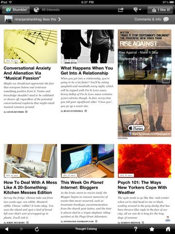 Van de ene naar de andere pagina springen doe je met de vertrouwde Stumble-knop die steeds linksboven in de app blijft staan, maar het is net zo makkelijk om er doorheen te bladeren alsof het een tijdschrift is. Het handige hieraan is dat je net zo makkelijk weer terugbladert, omdat de laatste paar bezochte pagina’s in het geheugen van je iPad geladen blijven. Met twee duimpjes rechtsboven geef je aan of je een geleverde pagina leuk vindt, zodat StumbleUpon weet of hij je vaker iets soortgelijks moet laten zien. Bevalt iets echt, dan favorite je het door op de ster rechtsonder te drukken. Deze favorieten komen je vrienden daarna weer tegen.