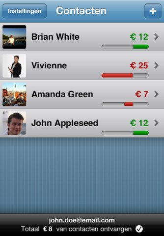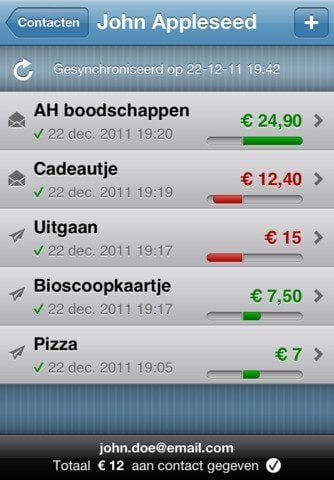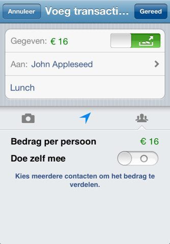 Nadat je een bedrag hebt ingevoerd, zie je in het hoofdscherm hoe ver de ene of meerdere betrokkenen al zijn met de verrekening van het geleende of uitgeleende geld. Bij het aanmaken van een verrekening geef je aan om welk bedrag het gaat, of je het hebt voorgeschoten of hebt gekregen en kies je een of meer geadresseerden aan de hand van hun e-mailadres. Ook kan je een omschrijving geven, een locatie toevoegen, foto toevoegen en aangeven of je zelf meebetaalt in het bedrag.