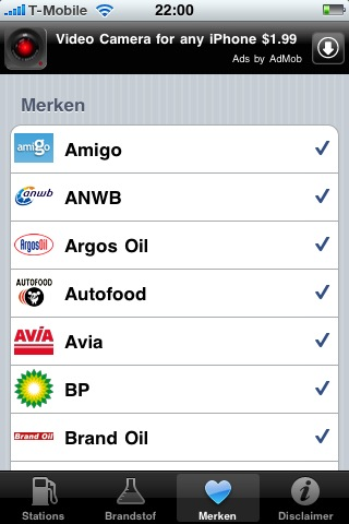 Er is een tabblad ‘Merken’ waarop je kunt aan- en uitvinken welke tankstations je wilt zien. Ook is er een tabblad ‘Brandstof’ om aan te geven welke brandstof je tankt: Diesel, Euro 95 of Euro 98. Op het laatste tabblad is een disclaimer met credits te vinden. In feite hoef je na het instellen van je brandstof en favoriete merken alleen nog het eerste tabblad te raadplegen.