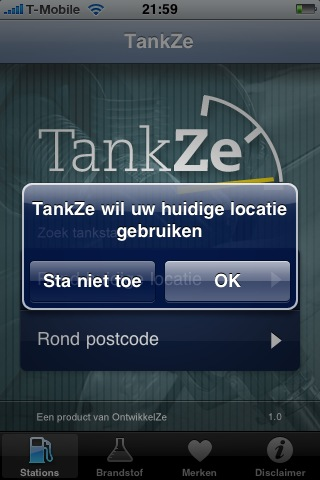 In de App Store is een nieuwe Nederlandse applicatie verschenen waarmee je benzine- en dieselprijzen kunt opvragen. Het is niet de eerste app waarmee dat kan, want Tanken (zie artikel) doet hetzelfde. TankZe geeft bij het opstarten twee opties: zoeken op basis van je huidige locatie of op basis van een postcode. Vervolgens krijg je een lijst te zien, gesorteerd op afstand, prijs of merk.