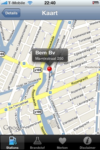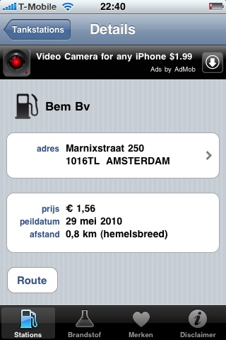 Bij de eerder verschenen applicatie Tanken was er kritiek dat niet alle tankstations te vinden waren. Nu wil ik niet op één ervaring afgaan, maar de Texaco in de buurt staat er echt niet in. Na wat zoeken blijkt deze Texaco als (merkloos) tankstation Bem in de lijst te staan. Dat moet je maar net weten. Bij elk tankstation zie je het adres (met mogelijkheid om naar een kaartje door te klikken), de actuele prijs, de peildatum en de afstand hemelsbreed. Ook kun je een route opvragen.