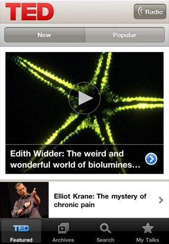 Naast de bibliotheek van video’s bevat TED op de iPhone ook TEDRadio. Hierop worden continu audiopresentaties uit het TED-archief uitgezonden, waar je onderweg naar kunt luisteren. Tijdens het luisteren kun je de app gewoon blijven gebruiken om te zoeken naar video’s.