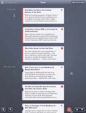 De applicatie heeft een overzichtelijke interface die van alle poespas is ontdaan. Zoals gezegd ligt de focus op content en die komt in de applicatie goed naar voren. Standaard toont The Feed alle items van Google Reader in een lijst met kleine blokjes. Aan de linkerzijde vind je een icoontje in de vorm van een punaise, waarmee je artikelen kunt vastpinnen, zodat ze niet als ongelezen worden gemarkeerd. Aan de rechterzijde kun je met het ster-icoontje aangeven dat je een artikel als favoriet wilt markeren. Bij gelezen items wordt door middel van een ‘hap’ uit het blokje duidelijk gemaakt dat je dat item al hebt gelezen.