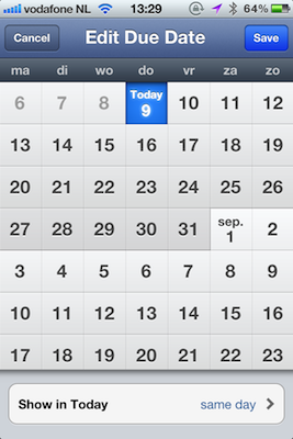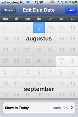 Bij het maken van een taak kun je voortaan aangeven wanneer hij afgerond moet worden op een nieuw kalenderscherm. Hierin staan alle dagen van het jaar in een scrollbare lijst, waardoor je niet op knoppen hoeft te tappen om je door verschillende maanden heen te bewegen. Tijdens het scrollen verschijnen de maanden duidelijk in beeld, zodat je niet verdwaald raakt tussen alle data.