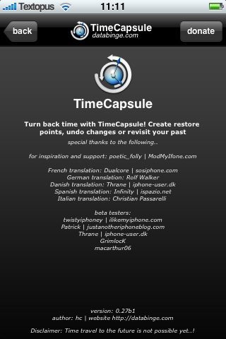 We hebben al een tijdlang geen aandacht besteed aan TimeCapsule, de applicatie waarmee je backups kunt maken van informatie op je iPhone. In de nieuwe versie TimeCapsule 0.27b1 zijn weer een aantal mogelijkheden toegevoegd, waarvan de belangrijkste is dat je ook een backup van je Preferences kunt maken. Verder kun je voortaan ook een backup maken van: Locations, Lockbox, Moleskine, MPG, PockeyMoney, Pumped en de Preferences.plist van SpringBoard.