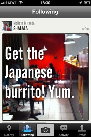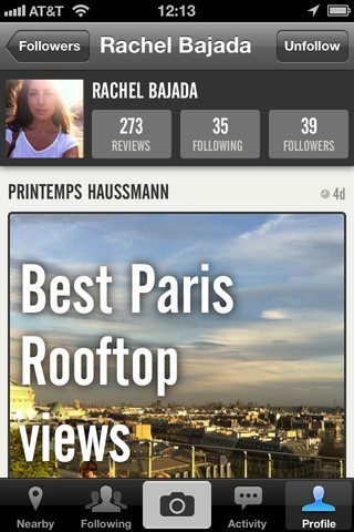 De structuur van de applicatie is niet zo ingewikkeld. Met het meest linker tabblad zie je de meest dichtstbijzijnde ‘recensies’ en met het tabblad ernaast zie je de laatste creaties van mensen die je volgt in de applicatie. Onder elke foto staan de opties ‘Like’ and ‘Add mine’, waarmee je meteen dezelfde locatie kan beoordelen. Met het middelste tabblad plaats je een nieuw bericht uit jezelf. Daarnaast zie je bij Activity ontwikkelingen en likes van volgers en tenslotte staar je bij Profile naar je eigen reviews en totale followers-gegevens.