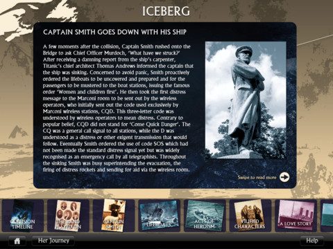 Het is honderd jaar geleden dat het gigantische cruiseschip Titanic stuitte op een ijsberg en zonk. Het verhaal is natuurlijk alom bekend dankzij de ongekend populaire speelfilm met Leonardi diCaprio en Kate Winslet uit 1997, maar wie wat dieper wil graven naar de geschiedenis van de scheepsramp, kan terecht bij een nieuwe iPad-app. Titanic: Her Journey vertelt het verhaal van het imposante schip van A tot Z; van foto’s van de bouw ervan tot de fouten die de kapitein maakte toen het kwaad was geschied.