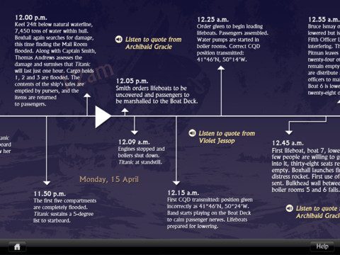 De Engelstalige iPad-applicatie behandelt allerlei aspecten van het schip en haar zinken en weegt dan ook 208 MB aan foto’s en ander beeldmateriaal. Zo is er bijvoorbeeld een tijdslijn waarin je bijna van minuut tot minuut ziet wat er gebeurde toen het schip ten onder ging. Het is een van de dertien hoofdstukken die je kan raadplegen in de applicatie. Een van die hoofdstukken is ook de bronnenlijst, zodat je ziet waar de informatie vandaan komt.