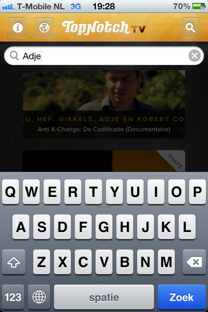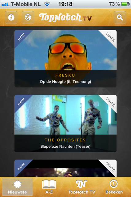 Zo zou een nieuws-tab bijvoorbeeld niet misstaan. Op de website van Top Notch is te lezen dat de nieuwe clip van Fresku, Op de Hoogte, 4 dagen exclusief te bekijken is in de applicatie. In de app krijg je hier echter niks van mee, behalve dat de clip de stempel new op zich geplakt heeft gekregen. Als je wel nieuws wilt lezen kun je dat alleen doen door op het wereldbolletje te klikken in de linkerbovenhoek van de applicatie. Enige probleem: dan verlaat je ook meteen de applicatie.