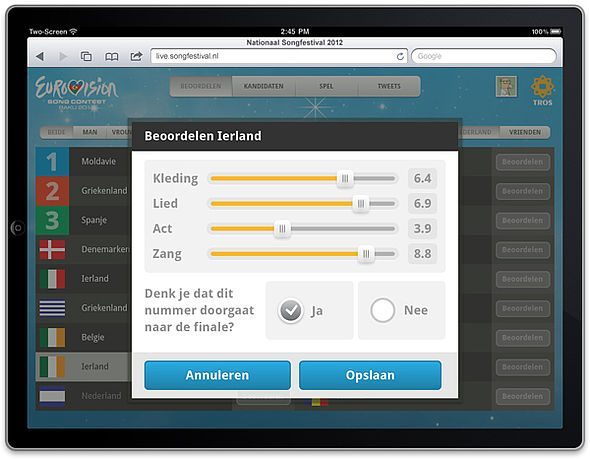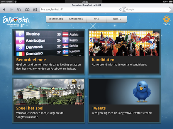 Deze week is het in Europa de week van het Eurovisie Songfestival. Vanavond en donderdag zijn er halve finales waarin wordt bepaald wie er uiteindelijk op zaterdagavond mee mogen doen. De Nederlandse inzending Joan Franka moet ons land donderdag verdedigen in de halve finale. Alle drie de avonden is er een live-uitzending van de TROS op Nederland 1 en de omroep heeft daarvoor een tweede scherm-applicatie laten ontwikkelen.