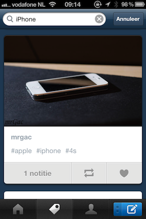 - Het ‘labeltje’ is de nieuwe tagzoekfunctie: voer een term in en de app toont postings van anderen met de genoemde tags.