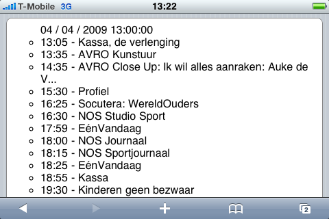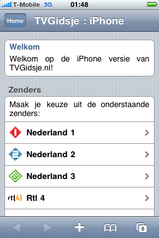 TvGidsje is een nieuwe Nederlandse applicatie, gemaakt door de 14-jarige Gregor Biljardt, dezelfde ontwikkelaar die eerder Eurochecker maakte. Gregor heeft de applicatie ontwikkeld in opdracht van de website TvGidsje.nl, waar je het tv-aanbod van diverse Nederlandse zenders kunt raadplegen. Er is wel een duidelijk verschil met de Belgische tv-applicatie Be Tv die een paar dagen geleden werd gelanceerd: bij Be Tv krijg je alle informatie in de applicatie zelf te zien. TvGidsje stuurt je na het tonen van een splashscreen door naar de webpagina tvgidsje.nl/iphone, waar je door de lijst met zenders kunt bladeren.