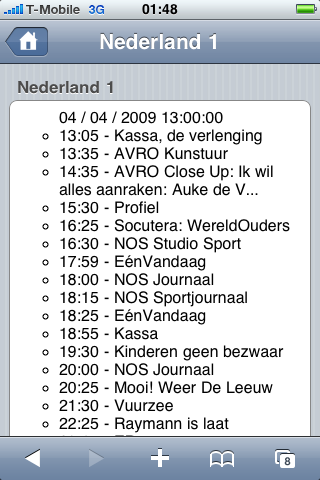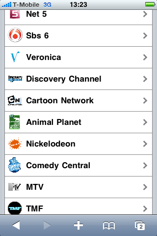 TvGidsje bevat het aanbod van de Nederlandse zenders en omroepen (Nederland 1, 2 en 3, RTL 4,5,7 en 8, Net 5, SBS 6 en Veronica), aaangevuld met buitenlandse zenders zoals Discovery, Cartoon Network, Nickelodeon, Comedy Central, MTV en TMF. Op dit moment toont de applicatie alleen een splashscreen, die je doorgestuurt naar de browser. Wie geen €0,79 voor de applicatie over heeft kan natuurlijk ook een webclip naar de website aanmaken; dat kost niets en het start ook nog sneller op. TvGidsje prijs daardoor zichzelf uit de markt.