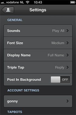 Dan mijn mening: top-app in wording. Nog niet alle benodigde functies waarvan de grootste ontbrekende landscape support en built-in push zijn. Aan dat eerste werkte ze, en ze zijn nog over dat tweede aan het denken. Gelukkig hebben we boxcar, en het is dan wel jammer dat daar een extra app tussen zit, maar het moet dan maar. Alhoewel je ook de gewone twitter app push kan gebruiken en dan niet de notificaties openen maar gewoon wegklikken en tweetbot openen ofzo. Ik dacht trouwens dat er een jailbreak cheat was dat je de app die geopend moet worden bij een push bericht kan aanpassen maar weet niet meer welke dat was 🙁