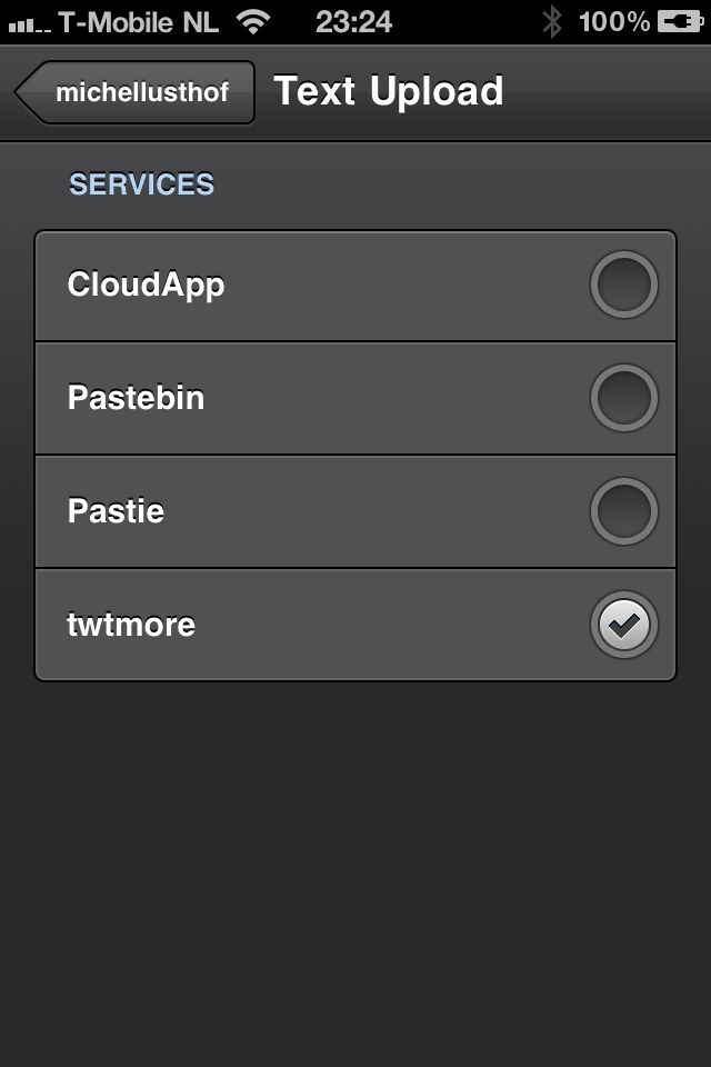 Ook nieuw in de laatste update van Tweetbot is de mogelijkheid om vanuit de applicatie tekstnotities bij een tweet te plaatsen. Via de knop ‘Add Note’ in het menu om een nieuwe tweet te maken kan een notitie worden geschreven, die vervolgens als link aan de tweet wordt toegevoegd. Hierdoor hoeven Twitter-applicaties geen aparte ondersteuning voor notities te hebben. Voor het uploaden van notities heb je als gebruiker de keuze uit de diensten CloudApp, Pastebin, Pastie en twtmore. Instellingen hiervoor bevinden zich in de account settings van Tweetbot.