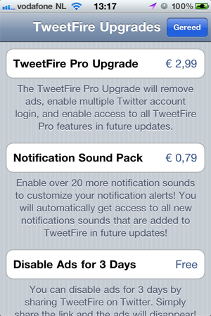Maar de nadruk ligt op snelheid en dat geldt niet alleen voor het laden van de berichten, maar ook voor het zoeken in je berichtenstroom, het openen van profielinformatie en het toevoegen van twitteraars aan lijsten. TweetFire is gratis, maar je kunt via een in-app aankoop extra geluidjes voor de push notificaties aanschaffen (€0,79). Een andere optie is om voor €3,99 de advertenties weg te halen). Eventueel kun je voor 3 dagen de advertenties uitschakelen, door reclame te maken voor TweetFire op Twitter. Dit kan vanuit de app.