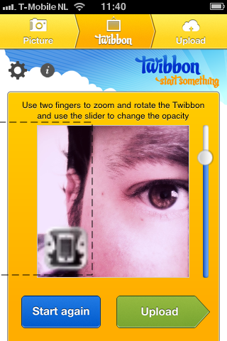 De volgende stap is het fraaist: daarin kun je de Twibbon op de foto positioneren, vergroten of verkleinen en de transparantie ervan instellen. Zo wordt het dragen van een logo op je twitterfoto toch nog iets eigens. In veel initiatieven die een Twibbon op je profielfoto plaatsen, is het namelijk zo dat je niets aan de plaats of aan het formaat kan doen. In deze app is dat dus anders.