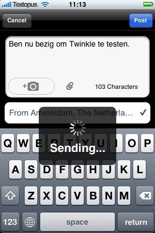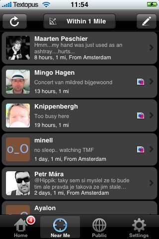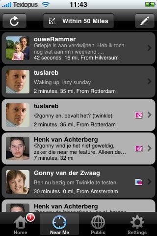Tot zover weinig nieuws ten opzichte van de normale Twitter-clients die er al zijn. De knop Near Me is wat Twinkle bijzonder zou moeten maken. Vorige week woensdag probeerde ik het al een paar keer en zag ik zowaar een bekende (“Hee, zin om koffie te drinken?”). Op zondagochtend is de kans groot om berichten als “Ben net wakker” en “Voel me niet lekker” tegen te komen. Kan interessant zijn, maar niet als het om wildvreemden gaat. Gelukkig zijn berichten waarin je zelf wordt genoemd voorzien van een lichtgrijs balkje, zodat je ze snel kunt herkennen.