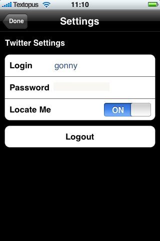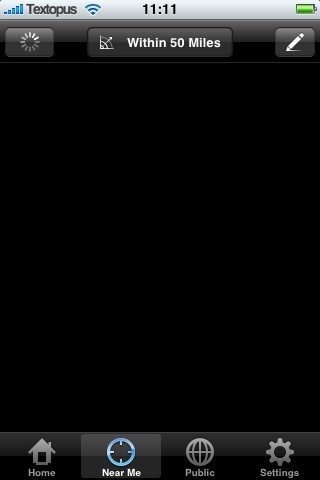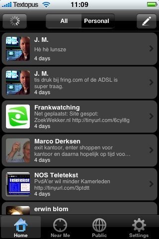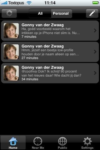 Onderaan het scherm zijn vier knoppen te zien: Home, Near Me, Public en Settings. De pagina Settings bevat weinig bijzonderheden: je kunt hier alleen je inloggegevens achterlaten en de functie Locate Me in- of uitschakelen. Op het Home-scherm zie je twee tabbladen: Personal met alleen je persoonlijke berichten en All voor een combinatie van berichten van jezelf en vrienden. Met een knop met een potloodicoontje kun je zelf een bericht schrijven, eventueel voorzien van foto. Die foto verschijnt niet op de website van Twitter zelf, maar wel in Twinkle. Coolhva meldt dat de foto’s op de Twinkle-server staan, maar later als tinyurl’s in Twitter zullen worden toegevoegd.
