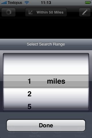 Je kunt zelf aangeven welke afstand je wilt: 1, 2, 5, 10, 25, 50, 100, 1.000 of 252.000 mijl. Omdat Amsterdam een tamelijk hoge iPhone-dichtheid heeft heb ik 1 mijl gekozen. Natuurlijk zie je niet alle Twitter-discussies van mensen die in de buurt zijn; alleen personen die Twinkle gebruiken en de functie Locate Me hebben ingeschakeld en dat zijn er niet veel: zelfs op een afstand van 5 mijl zijn de meeste berichten al een paar uur oud.