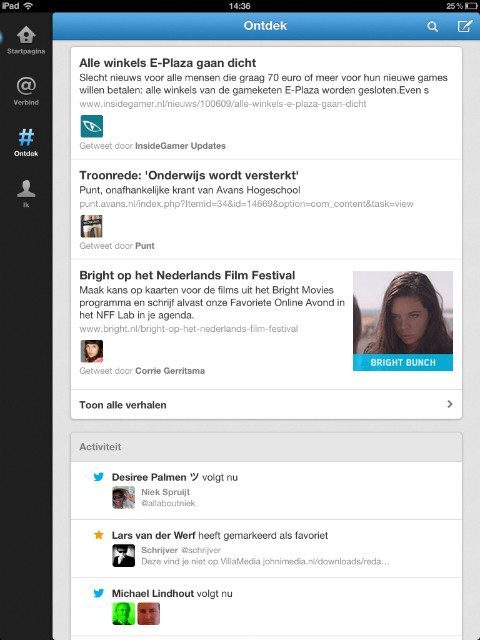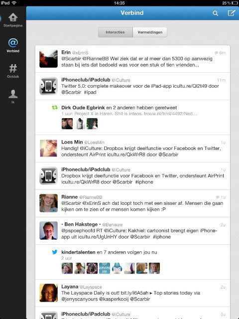 Twitter voor de iPad is geüpdatet naar versie 5.0 en loopt daarmee eindelijk in de pas met de al veel eerder vernieuwde opzet van de website en dezelfde applicatie op de iPhone. De indeling wijkt daarmee af van Twitter-apps zoals je die kent op de iPad. De berichtenstroom is opgedeeld in de Startpagina, Verbind, Ontdek en Ik. Met de update is ook een nieuw uiterlijk voor profielpagina’s doorgevoerd en kan je niet langer gebruik maken van externe fotodiensten. Opvallend genoeg is ook de slimme panelen-layout overboord gegooid. Vensters worden nu in volledig scherm geopend.