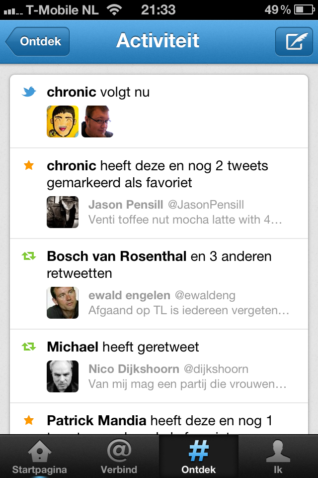 Bij de introductie van de nieuwe versie introduceerde Twitter de Ontdek-tab om eenvoudiger te ontdekken wat er zoal op Twitter gebeurt. In deze laatste update gaat het bedrijf nog een stapje verder met de toevoeging van zogenaamde Activiteiten. Hierin vind je terug wie de mensen die jij volgt volgen, welke tweets zij retweeten of als favoriet markeren. Verhalen binnen de Ontdek-tab zijn ook verbeterd. Voortaan kun je met één tap op verhalen of trending topics de bijbehorende tweets lezen en daarop reageren.