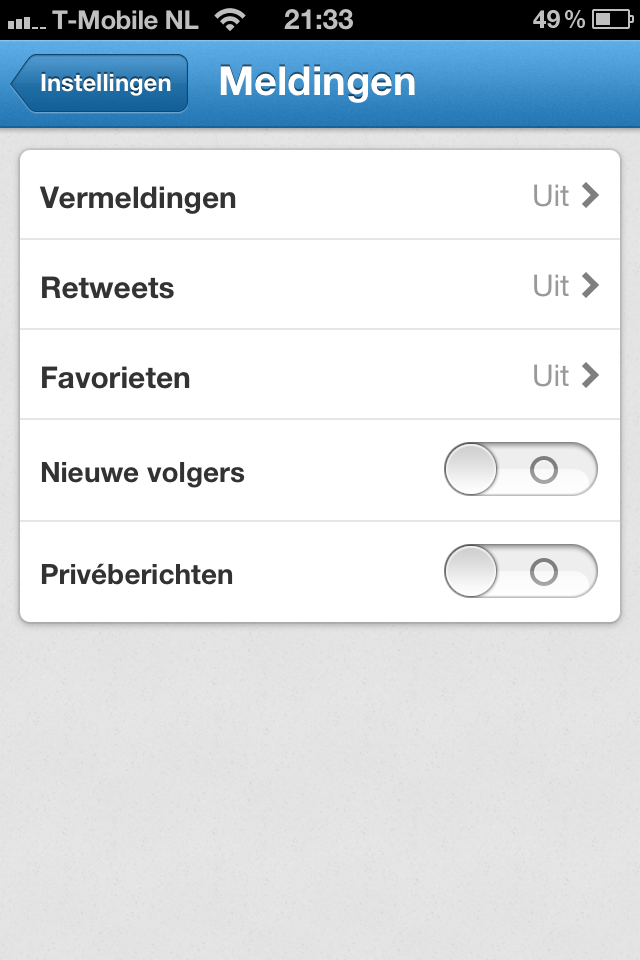 Tot slot heeft Twitter de pushnotificaties uitgebreid met functies die in veel alternatieve Twitter-clients al geruime tijd mogelijk waren. Als gebruiker kun je nu aangeven of je meldingen wilt ontvangen als je tweets geretweet of als favoriet gemarkeerd worden of wanneer je er een nieuwe volger bij krijgt. Opvallend is wel dat Twitter, een kleine vier maanden na de introductie van een compleet vernieuwde app, nog steeds geen gelijkwaardige update voor de iPad-applicatie heeft uitgebracht.