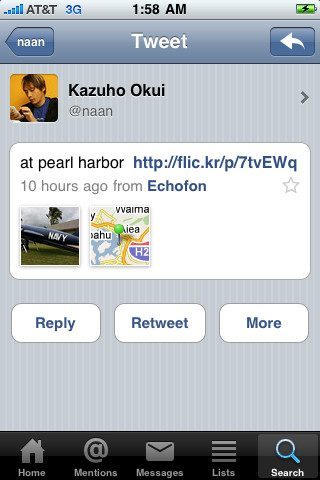 De opzet van Echofon is helder. Onderin de balk staan vanaf links bezien je timeline, mentions, direct messages, Twitter-lists en een zoekfunctie. De laatste heeft ook de grappige functie om op tweets te zoeken die in de buurt zijn geschreven en gepubliceerd. Je kan zoektermen onthouden voor later gebruik (een functie die wordt gedeeld in Twittelator Neue en Tweetbot) en er is een zoekbalk waarmee je door de timeline kan zoeken. Van de drie applicaties op deze pagina, ligt de ervaring van Echofon het dichtst bij de oude Twitter-app. Wel moet je de gratis applicatie Boxcar (App Store-link) installeren om pushmeldingen van mentions en retweets te krijgen. Die kan je vanuit die gratis applicatie meteen openen in Echofon.