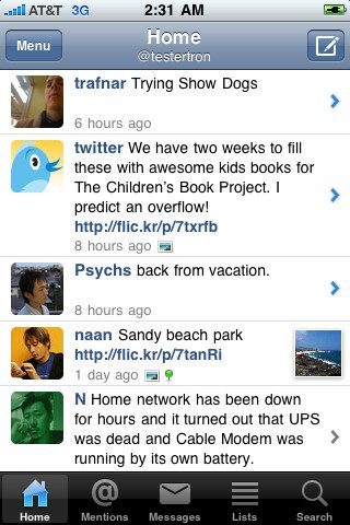 Twittelator Neue is een van de mooiste Twitter-applicaties op de iPhone en iPod touch. Na een korte periode van gewenning voelt Twittelator Neue vrij snel als een natuurlijke Twitter-ervaring op de iPhone. In de basis heeft Twittelator een zwarte, tekstloze navigatiebalk aan de onderkant van het scherm die verdwijnt als je hem langzaam naar beneden ‘duwt’. Je kan hem weer oproepen met een tik op het beeld. De balk hanteert de volgende volgorde van links naar rechts: profielinformatie, direct messages, timeline, mentions en opties. Je kan ook schakelen door tussen de verschillende pagina’s te swipen. Door in de timeline op de bovenbalk te drukken, kun je doodeenvoudig schakelen tussen meerdere accounts.