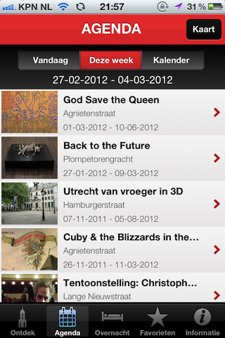 In het opstartscherm bevinden zich vier onderdelen. ‘Voor het eerst in Utrecht’ bevat een overzicht van dingen die je volgens de VVV echt moet hebben gezien en gedaan in de stad. De onderdelen zijn allemaal voorzien van een afbeelding, omschrijving en adresinformatie. Ook zie je welke evenementen er plaatsvinden. Onder ‘Zien & Doen in Utrecht’ vind je overzichten van bezienswaardigheden, musea, natuur, voorstellingen en nog veel meer. De andere twee onderdelen zijn: ‘Eten & drinken in Utrecht’ en ‘Winkelen in Utrecht’. Die spreken voor zich, al moet er bij worden gezegd dat het winkel-deel zeer beperkt is.