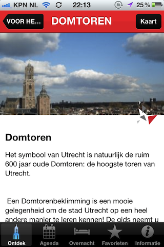 De VVV van Utrecht heeft eigen City Guide gelanceerd. De gratis app is een complete stadsgids met informatie over bezienswaardigheden, cultuur, natuur, winkelen, uitgaan, eten en overnachten. Je ziet bij alles direct hoe ver het van je huidige locatie af is. Ook is er een agenda waarin je kunt opzoeken welke evenementen wanneer worden georganiseerd in de stad. Uiteraard bevat de app een kaart waarop alle onderdelen te vinden zijn. Ook kun je zoeken naar specifieke dingen.
