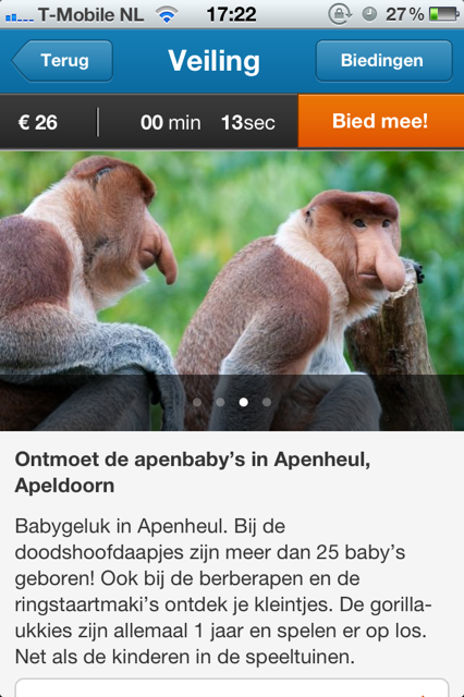 De applicatie biedt meer aan dan alleen veilingen van vakanties, er worden namelijk ook bijvoorbeeld beauty arrangementen en diners geveild. Daarom is de “in de buurt”-functie binnen de app handig. Je kunt in lijst- en in kaartvorm zien waar er in de buurt iets geveild wordt en direct meebieden.
