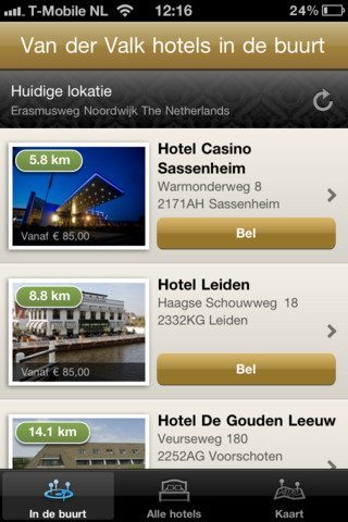 Je kan de dichtstbijzijnde hotels zien op een kaart met het meest rechter tabblad; het meest linker zet ze op een rij met naam, adres, de vanafprijs en een foto. Met een groene balk in de foto zie je hoe ver je van het hotel vandaan bent. De applicatie gebruikt steeds andere kleuren op de verschillende pagina’s maar ziet er strak en zakelijk uit. Qua inhoud richt het zich qua arrangementen en hotelinformatie met name op niet-zakelijke hotelovernachters. Saillant detail is dat de pagina ‘hotels in de buurt’ knoppen en een navigatiebalk in de kleur van appelmoes hebben – een toefje waar de keuken van Van der Valk bekend om staat. Het middelste tabblad laat alle hotels in een overzicht zien, begeleid door een zoekfunctie.
