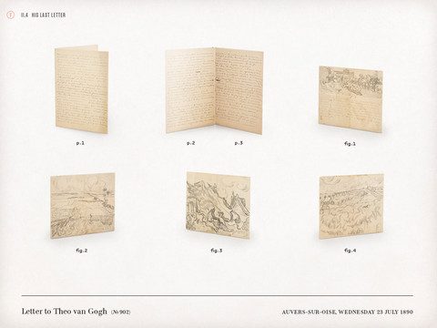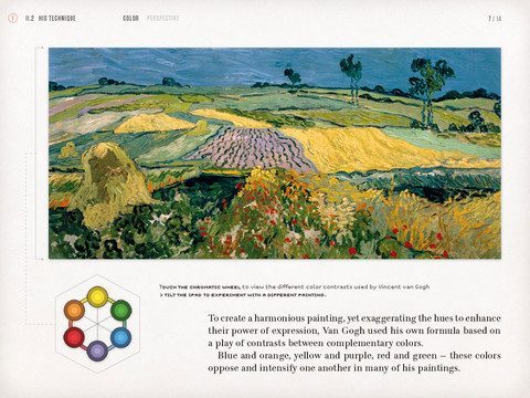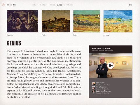 Verbazingwekkend genoeg werken alle principes en bladzijden net zo goed in de staande als liggende houding van de iPad. Als er afbeeldingen vergroot kunnen worden, tref je er een rood pijltje bij. Op video’s staan duidelijke Play-knoppen en rechts van pagina’s met voorbeelden van Van Gogh’s werk, tref je links naar andere werken, uitvoeringen of teksten. Temeer is de terug-naar-vorige-pagina knop linksboven een uitkomst. De teksten zijn geknipt in korte alinea’s van 5 tot 10 regels, geschreven in een traditioneel boek-achtig lettertype en opgeluisterd door quotes en afbeeldingen.