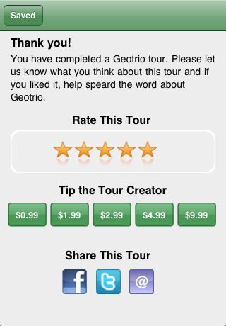 Geotrio Tours is een applicatie voor de iPhone waarmee je kan zoeken naar routes. De app geeft zelf een overzicht met leuke routes, maar je kan ook zoeken binnen de regio waar je je bevindt. De routes worden aangegeven op een kaart en de bijzondere plekken zijn geaccentueerd. Soms hebben ze zelfs ingesproken audio-opnames van een reisgids, die er wat over vertelt. Na het afleggen van een route kun je de digitale reisgids een fooi geven, variërend van 80 eurocent tot 8 euro. Die reisgids hoeft geen aardrijkskundige te zijn. Nee, het leuke is dat je zélf die reisgids kan zijn met behulp van de iPhone-app TourRecorder.