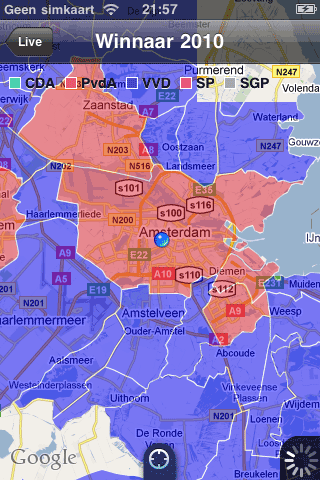 Nog even een technische note/vraag aan de volgers van iphoneclub: Voor onze verkiezingskaart hebben we succes ‘map layers’ over Google Maps geprojecteerd. Volgens ons is dit nog niet eerder gedaan. Kent iemand een App waar een soortgelijke techniek is toegepast?