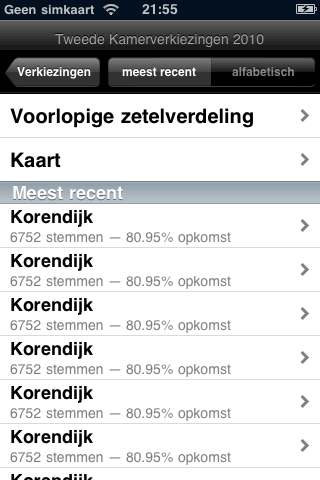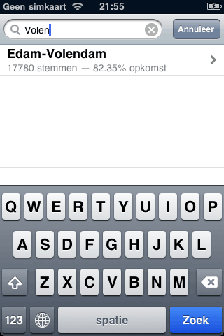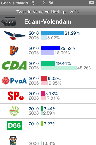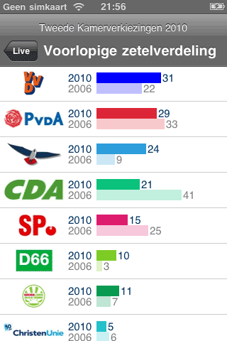 verkiezingskaartHelaas keurde Apple de applicatie Verkiezingskaart niet op tijd goed, waardoor de applicatie niet op het cruciale moment in de App Store te vinden was. Maar de ontwikkelaar stelt wel adhoc-versies van Verkiezingskaart beschikbaar, zodat we toch nog kunnen kijken wat we hebben gemist. Vanaf gisteravond 21:00 uur zijn in de applicatie en op de bijbehorende website Verkiezingskaart.nl de uitslagen van de Tweede Kamer-verkiezingen te vinden. De app maakt ook gebruik van push notificaties: niet met geluiden en pop-ups, maar alleen met een badge op het applicatie-icoon.