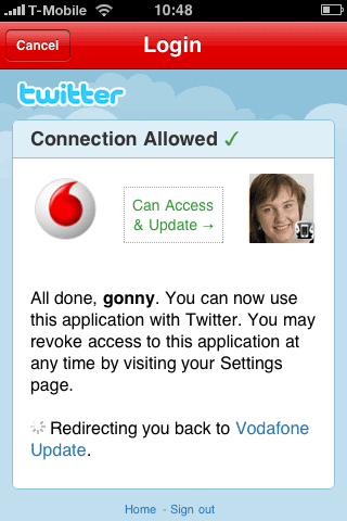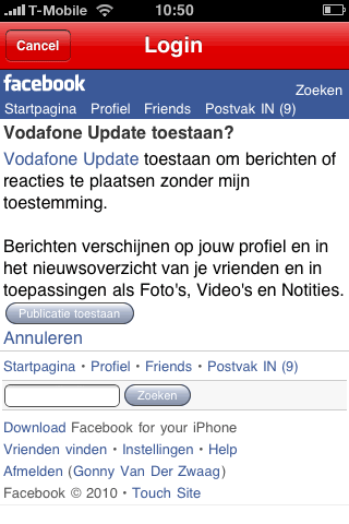 Nederland is nu eenmaal een land van Hyvers en daar verander je met een (van oorsprong Duitse) Vodafone-applicatie met alleen de bekende internationale netwerken niets aan. Maar is het allemaal kommer en kwel? Ik heb Vodafone Update geïnstalleerd om te kijken of je er echt niets aan hebt. MySpace is voor de meeste Nederlanders niet interessant en Twitpic is één van de vele plaatjesdiensten voor Twitter, dus niet iedereen zal er een account hebben. Het aanmelden bij Twitter verliep erg snel: binnen een paar seconden staat je account erin. Bij Facebook kost het wat meer tijd en kwam ik een scherm tegen waar ik liever geen ja op zeg (zie hiernaast): je geeft de applicatie toestemming om zonder jouw toestemming berichten op Facebook te plaatsen. Wat die berichten inhouden werd me niet duidelijk (misschien is het onschuldig), maar het leek me beter om maar gewoon te annuleren. Je kunt dan nog wel van de andere Facebook-functies gebruik maken.