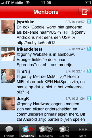 Vodafone Update toont de gebeurtenissen in een berichtenstroom. Je kunt antwoorden op berichten, retweeten, foto’s uploaden en URL’s inkrimpen via een interface die erg veel op de Tweetie lijkt. Vodafone heeft de technologie bij Tweetie ingekocht of de lay-out schaamteloos gekopieerd. Eigenlijk is het me nog steeds niet duidelijk waarom de applicatie niet zo geliefd is: komt het inderdaad omdat Hyves afwezig is? Of verwachten mensen van een operator dat het mobiele netwerk goed werkt en regel je je sociale netwerk zelf wel?