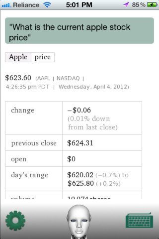 Voice Answer is een Engelstalige applicatie. Dankzij de integratie van de database van Wolfram Alpha, is het een bijzonder slimme toepassing. Je kan hem bijvoorbeeld natuurkundige en wiskundige opdrachten geven (Integrate sin x dx from x=0 to pi), dingen laten omrekenen, vragen hoe laat het is aan de andere kant van de wereld en geografische vragen voorleggen (What is the average income in Sao Paulo?). In tegenstelling tot Siri, is een herinnering laten zetten Voice Answer echter teveel moeite.