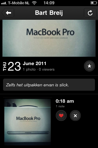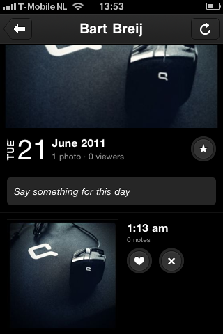 Pas als je een vriend hebt toegevoegd, komt de ware bedoeling van Vvall naar boven. Je kan door iemands foto’s scrollen en leuke foto’s niet alleen favorieten, maar ook toevoegen aan je eigen wall. Zo kun je je eigen wall samenstellen uit eigen foto’s en dus ‘belevenissen’. Niemand kan de inhoud van je eigen wall beïnvloeden.
