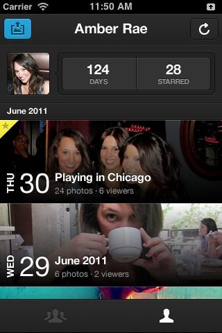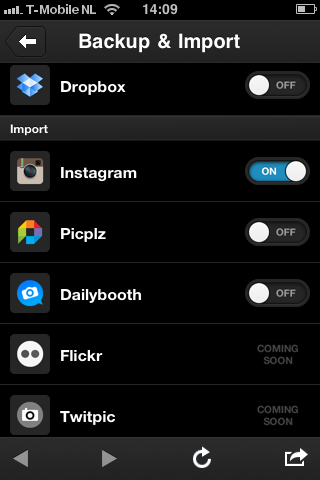 De andere optie om foto’s te verkrijgen via de eerder genoemde media, herbert zich onder een ander tabblad bij de instellingen, en dan in het submenu Backup & Import. Foto’s toevoegen via bijvoorbeeld Instagram gaat snel en eenvoudig. Ze staan praktisch meteen in je wall… alleen je ziet dat in het begin nog niet. Het blijkt dat je eerst nog de refresh-knop rechtsboven in het scherm moet drukken. Dat is op meer momenten zo in de applicatie, bijvoorbeeld nadat je een vriend hebt toegevoegd en je die nog niet in het lijstje ziet staan.