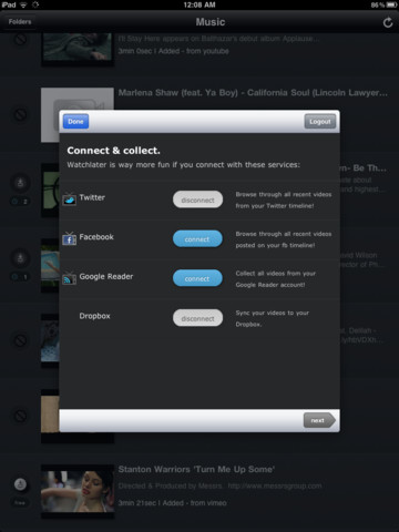 Je installeert in je browser een bookmarklet door een stukje code in je favorieten te zetten. Hoe je dit precies moet doen, vertelt de app je stap voor stap wanneer je hem voor het eerst opstart. Vervolgens maak je een account, waarmee je inlogt in zowel de app als in je browser. Hierdoor worden de twee met elkaar geassocieerd en communiceren ze ook met elkaar. Druk je hierna op de link je favorieten als je op een webpagina met een video zit, dan wordt deze in de app geladen zodra je hem de volgende keer opstart. Niet alleen videobeelden van je bookmarklet belanden in Watchlater. Door je Twitter en Facebook-account er aan te koppelen krijg je ook alle gedeelde video’s op deze netwerken in een tijdlijn te zien.