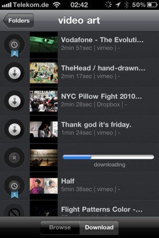 Binnen de app kun je twee dingen doen met je video: zo kun je hem bijvoorbeeld gewoon bekijken, zoals je ook eerder in je browser deed. Hierbij wordt de gebruikelijke mediaspeler gebruikt, die ook via AirPlay de video naar je Apple TV 2G kan sturen. Zit je straks even zonder internet, dan kun je ook de video offline opslaan om op een later moment te openen. Dit lijkt in de eerste instantie gratis, maar zodra je eerste offline minuten verstreken zijn is het al snel duidelijk: er dient betaald te worden om video’s te blijven opslaan. Dit doet Watchlater per minuut, wat neerkomt op 79 cent voor 150 minuten aan video.