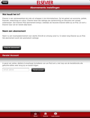 Gebruikers die al een papieren abonnement op Elsevier hebben, zullen enigszins teleurgesteld zijn. Er is namelijk geen koppeling tussen het papieren en digitale abonnement. Binnen de applicatie is er wel een mogelijkheid om bij verlies, diefstal of onverhoopt formatteren van je iPad je digitale account te herstellen. Alle edities die je op de iPad downloadt, zijn beschikbaar voor offline gebruik.