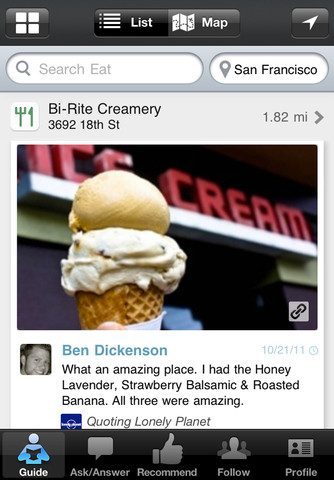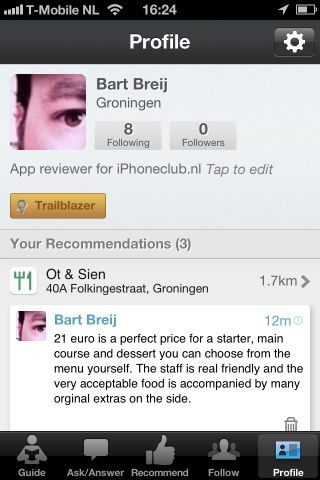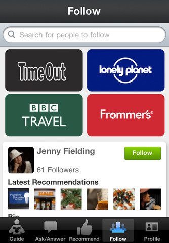 Wie zich aanmeldt, krijgt vlak na het aanmaken van een account het Follow-tabblad te zien, waarin je met enkele drukken meteen de TimeOut, Lonely Planet, BBC Travel, Frommer’s en individuele medewerkers van reisgidsen als ware het persoonlijke adviseurs kan volgen. Hun waarderingen komen dan terecht in het tabblad Guide, als je tenminste in de buurt bent van een locatie die ze hebben aangedaan en voorzien van adviezen. De grote bronnen hebben voor lang niet alle locaties adviezen en dus kan je gemakkelijk géén resultaten vinden als je zoekt op aanbevelingen in en om je woonplaats. Met de locatieknop rechtsboven, worden de dichtstbijzijnde resultaten bovenaan getoond en zie je meteen hoe ver je van die plek verwijderd bent.